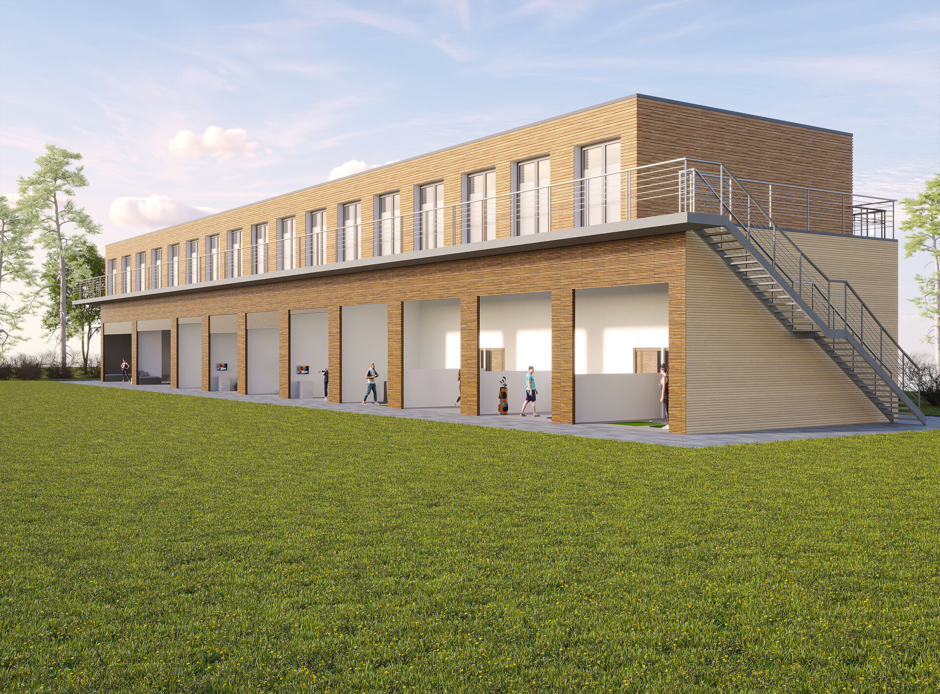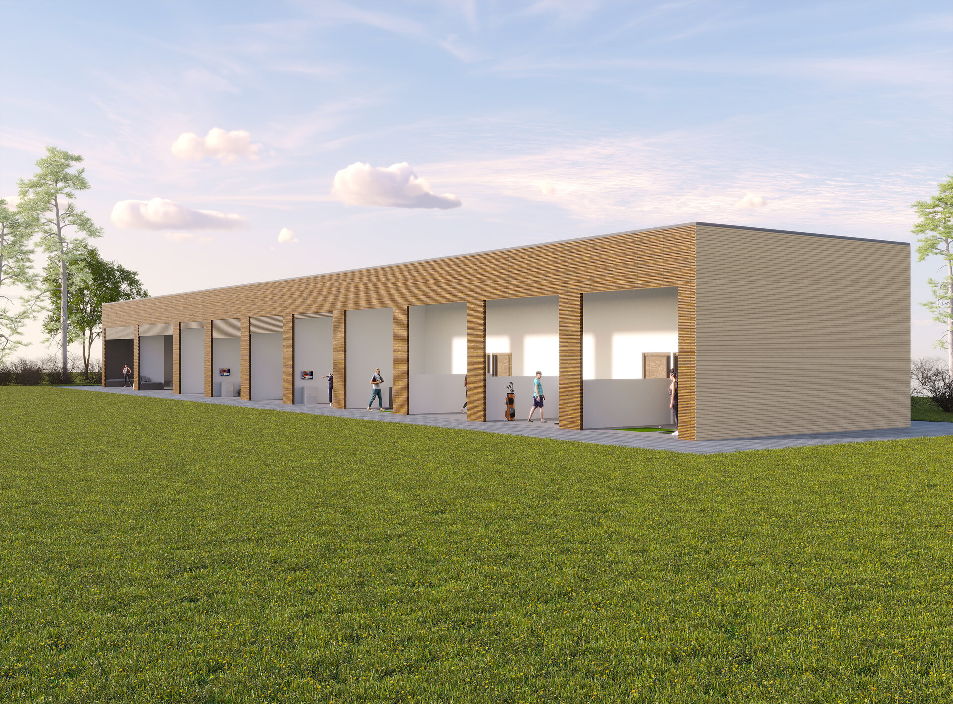 Unsere Vorher-Nachher-Ansicht zeigt, wie Sie diese mit unseren XSCUBES zusätzlich vielseitig erweitern können. Durch Überbauung der Driving Range erhalten Sie z.B. schicke, hochwertige Apartments für Gäste und Turnierteilnehmer.